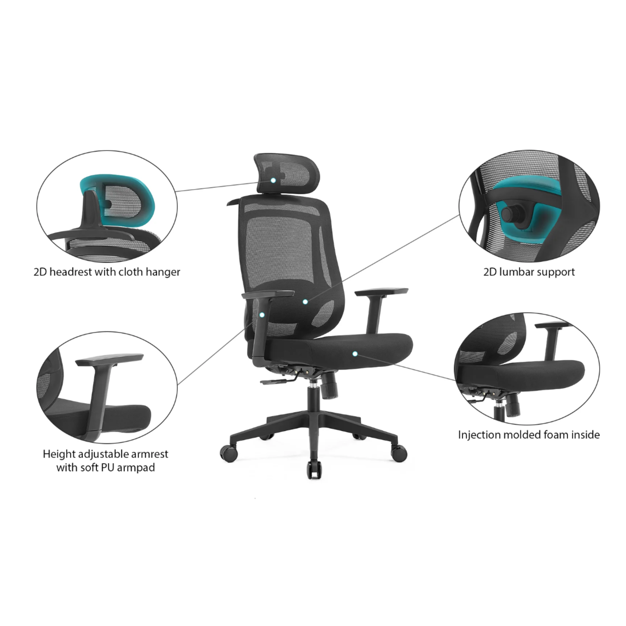 2. Dossier en maille avec structure en PP + soutien lombaire 2D et appui-tête 2D avec porte-vêtements