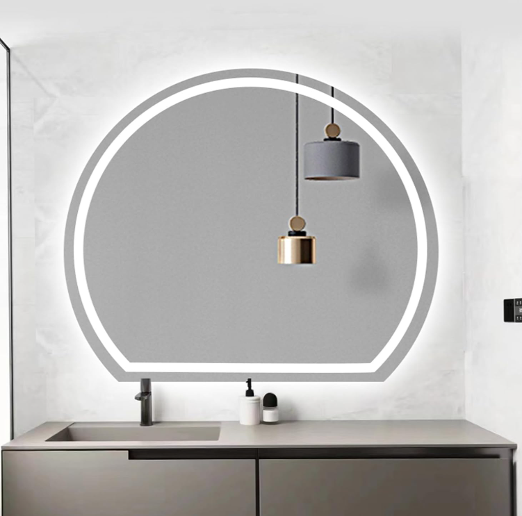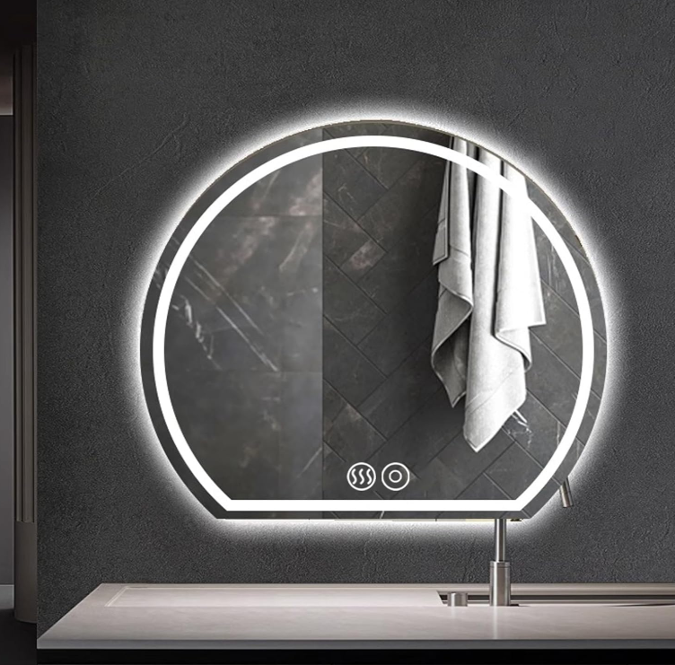 - Miroir LED sablé à bord en acier inoxydable doré au zirconium, interrupteur double et fonction antibuée