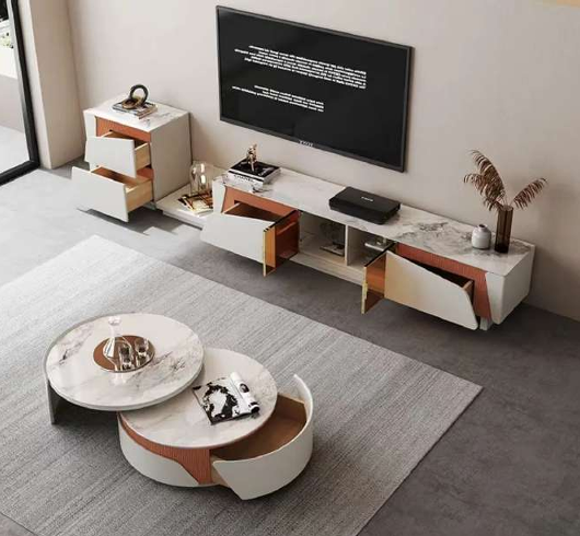 - Meubles laqués avec tiroirs en bois massif, plateau en pierre matte